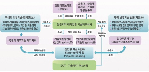 아래 그림은 강원기술지주회사의 운영 체제를 도식적으로 보여주고 있다. 강원도 내 5개 대학은 기술을 현물로 출자하고 있으며 강원도는 강원테크노파크을 통하여 현금을 출자하여 기술지주회사 설립을 지원하였다. 지주회사는 대학이 보유한 기술과 지역 내 R&D 결과물을 국내외 관련 산업체와 연계하여 자회사를 창출하고 육성하고 있다.